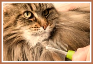 2-Groom your cat regularly. Grooming is very important. It prevents hairballs, stimulates your cats' blood flow, stops cat hair left when you pat her/him and provides some good bonding time for you and your cat. If your cat has long fur, a pin brush is best for working through long coat. A flat and slicker brush would work better for short fur. A smaller, triangular shaped brush can be used for smaller areas, like around the face and ears. If you want to use a comb, use a wide toothed comb for long fur, and a fine toothed one for short fur. You may want to buy a smaller and more gentle brush for a kitten.